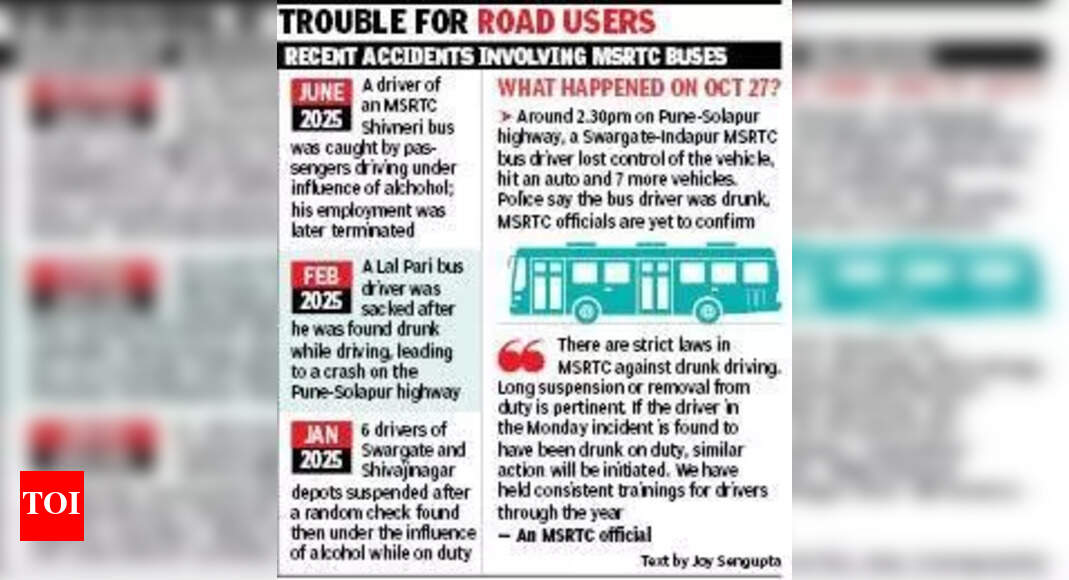 पुणे: पुणे-सोलापूर महामार्गावर सोमवारी महाराष्ट्र राज्य मार्ग परिवहन महामंडळाच्या (एमएसआरटीसी) बसने दिलेल्या धडकेत कार चालक जखमी झाला असून, ऑटोरिक्षा आणि कार अशा किमान आठ वाहनांचे नुकसान झाले आहे. ही घटना दिवसाढवळ्या रात्री 2.30 च्या सुमारास घडली आणि त्यावेळी राज्य परिवहन (ST) बसमध्ये 25 प्रवासी होते. हडपसर पोलिसांचे वरिष्ठ निरीक्षक संजय मोगले यांनी TOI ला सांगितले की, “अटक करण्यात आलेल्या 42 वर्षीय बस चालकाच्या प्राथमिक वैद्यकीय तपासणी अहवालावरून असे दिसून आले आहे की, तो दारूच्या नशेत बस चालवत होता.” बस इंदापूरहून स्वारगेटला जात होती. जखमी कार चालकांपैकी एक, हडपसर येथील भेकराईनगर येथील पांडुरंग घिरे (46) याच्या पायाला दुखापत झाली असून, त्याने पोलिसांत तक्रार दाखल केली. इतर अनेक वाहनांचेही मोठे नुकसान झाले. मोगले म्हणाले, “घटनास्थळी वाहतूक संथ गतीने सुरू होती आणि काही वाहने एका इंधन स्टेशनमध्ये घुसली. एका ऑटोला धडक दिल्याने बस चालकाचे चाकावरील नियंत्रण सुटले आणि बस पुढे जाऊन तक्रारदार घिरे यांच्या कारसह इतर सात वाहनांना धडकली. वाहतूक कोंडीमुळे बस अडकली, लोकांनी पोलिसांना बोलावले. आमच्या पथकाने बस चालकाला घटनास्थळावरून ताब्यात घेतले.” ते पुढे म्हणाले, “बस ड्रायव्हरला ससून जनरल हॉस्पिटलमध्ये नेण्यात आले, जिथे प्राथमिक वैद्यकीय अहवालात तो दारूच्या नशेत गाडी चालवत होता, असे नमूद केले आहे. त्यानंतर आम्ही त्याच्यावर मद्यपान करून गाडी चालवल्याचा आरोप लावला आहे. त्याच्या रक्ताचे नमुने पुढील तपासणीसाठी पाठवण्यात आले आहेत आणि त्यांच्या अहवालाची प्रतीक्षा आहे. या धडकेमुळे काही ऑटो आणि कारचे मोठ्या प्रमाणात नुकसान झाले आहे.” पुणे एमएसआरटीसीचे विभागीय नियंत्रक अरुण सिया म्हणाले, “आमच्या माहितीनुसार, ड्रायव्हर मद्यधुंद होता की नाही याचा वैद्यकीय अहवाल येणे बाकी आहे. कारवाईच्या आधारे दिलेला प्राथमिक अहवालही ससून रुग्णालयाने आम्हाला दिलेला नाही. चालकाचा ट्रॅक रेकॉर्ड चांगला आहे, आणि बस इंदापूर आगाराची आहे. जोपर्यंत अहवाल येत नाही, तोपर्यंत आम्ही त्याच्यावर कारवाई करू देणार नाही. अहवालात तो नशेत असल्याचे सिद्ध झाल्यास, योग्य ती कारवाई केली जाईल.” (जॉय सेनगुप्ता यांच्या इनपुटसह)