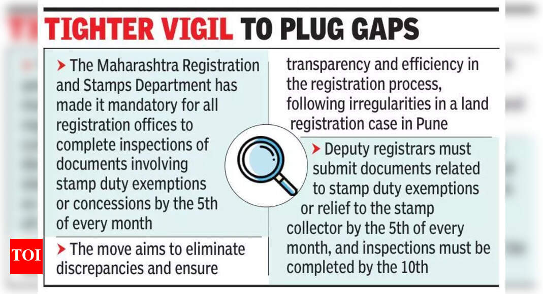 पुणे: महाराष्ट्र नोंदणी आणि मुद्रांक विभागाने राज्यभरातील सर्व नोंदणी कार्यालयांना मुद्रांक शुल्क सवलत किंवा सवलतींसह दस्तऐवजांची तपासणी प्रत्येक महिन्याच्या 5 तारखेपर्यंत पूर्ण करणे बंधनकारक केले आहे.नोंदणीचे सह महानिरीक्षक आणि मुद्रांक अधीक्षक (मुख्यालय) राजेंद्र मुठे यांनी सोमवारी एका परिपत्रकाद्वारे हे निर्देश जारी केले. त्यांनी सर्व उपमहानिरीक्षक नोंदणी आणि मुद्रांक संग्राहकांना अशा दस्तऐवजांची वेळेवर छाननी करण्याचे निर्देश दिले आहेत. मुठे यांनी TOI ला सांगितले की, “आम्ही विसंगती दूर करण्याचे उद्दिष्ट ठेवतो आणि हा आदेश राज्यभरातील आमच्या सर्व कार्यालयांना लागू होतो.” महाराष्ट्रात सध्या 519 उपनिबंधक कार्यालये आहेत.पुण्यातील हवेली क्रमांक 4 सह उपनिबंधक कार्यालयात जमीन नोंदणी प्रकरणात अनियमितता आढळून आल्यावर हा उपक्रम हाती घेण्यात आला आहे, जेथे प्राथमिक निष्कर्षांनी मुद्रांक शुल्काचे नुकसान आणि प्रक्रियात्मक त्रुटी दर्शवल्या आहेत. याला उत्तर म्हणून राज्य सरकारने सविस्तर चौकशी करण्यासाठी एक समिती स्थापन केली आहे.2014 च्या विभागीय आदेशात सुरू करण्यात आलेल्या “तत्काळ तपासणी” प्रणालीचे काटेकोरपणे पालन केले जात नसल्याचे परिपत्रकात म्हटले आहे. तपासणीदरम्यान आढळून आलेल्या कोणत्याही अनियमितता किंवा त्रुटींची माहिती महानिरीक्षकांच्या कार्यालयात विलंब न लावता, चूक करणाऱ्या अधिकाऱ्यांवर कारवाई करण्याच्या शिफारशींसह कळवावी, असेही निर्देश दिले आहेत.हे परिपत्रक जमीन व्यवहार आणि मुद्रांक शुल्क माफीच्या वाढत्या छाननीच्या दरम्यान आले आहे, विशेषत: उच्च-मूल्याच्या सरकारी जमीन व्यवहारांमध्ये अधिकाराचा गैरवापर केल्याबद्दल पुण्यातील अलीकडील तपास आणि निलंबनानंतर. “उपनिबंधकांनी आता मुद्रांक शुल्क सवलत किंवा सवलतीशी संबंधित सर्व कागदपत्रे संबंधित मुद्रांक कलेक्टरला प्रत्येक महिन्याच्या 5 तारखेपर्यंत सादर करणे आवश्यक आहे. मुद्रांक संग्राहकाने 10 तारखेपर्यंत तपासणी पूर्ण करणे आवश्यक आहे,” असे एका अधिकाऱ्याने सांगितले.अधिकाऱ्याने सांगितले की, नोंदणी प्रक्रियेत पारदर्शकता आणि कार्यक्षमता सुनिश्चित करणे, विशेषत: मुद्रांक शुल्कावरील सूट किंवा सवलतींचा समावेश असलेल्या दस्तऐवजांसाठी या हालचालीचा उद्देश आहे. “नियमित तपासणी करून, विभाग दस्तऐवजांची सत्यता पडताळू शकतो आणि संभाव्य गैरवापर किंवा महसूल गळती रोखू शकतो,” अधिकारी पुढे म्हणाले.