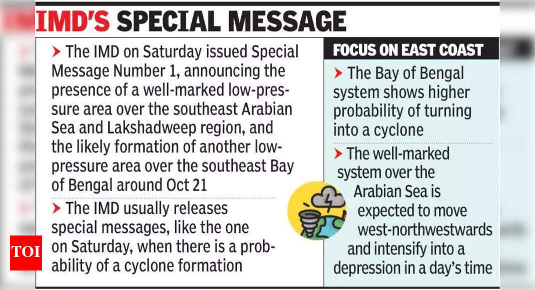 पुणे: आयएमडीने शनिवारी आग्नेय अरबी समुद्र आणि लक्षद्वीप प्रदेशात कमी दाबाच्या क्षेत्राची उपस्थिती जाहीर केली आणि 21 ऑक्टोबरच्या सुमारास आग्नेय बंगालच्या उपसागरात आणखी एक कमी