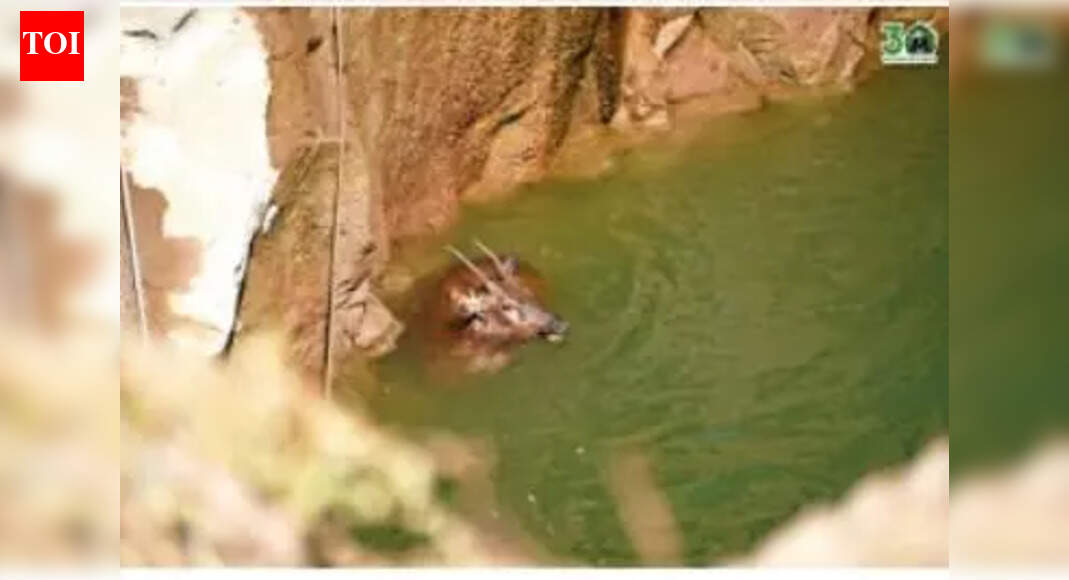 पुणे: जुन्नरमधील आल्मे गावात 40 फूट विहिरीत पडल्यानंतर, एक प्रौढ नर सांबर हरिण एका अरुंद दगडी कठड्यावर अनेक तास उभे होते, पोटापर्यंत पाणी होते आणि