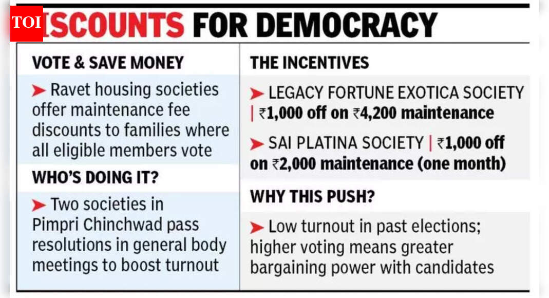 पुणे: आगामी महापालिका निवडणुकीत मतदारांची संख्या वाढविण्याच्या प्रयत्नात पिंपरी चिंचवडमधील गृहनिर्माण सोसायट्यांमधील रहिवाशांनी सर्व पात्र सदस्यांनी मतदान केल्याची खात्री करणाऱ्या कुटुंबांना मासिक देखभाल शुल्कात सवलत