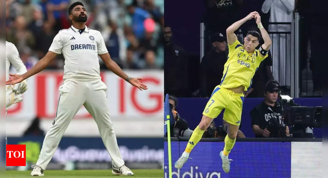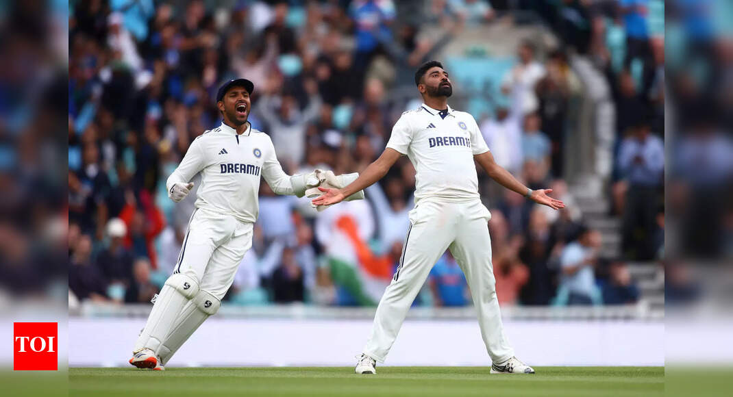 मोहम्मद सिराजने 5 व्या कसोटीच्या पाच दिवसात गस अॅटकिन्सनची विकेट (सरे सीसीसीसाठी बेन हॉस्किन्स/गेट्टी इमेजेस) च्या पाच दिवसात साजरा केला. ओव्हल येथे झालेल्या अंतिम कसोटी
